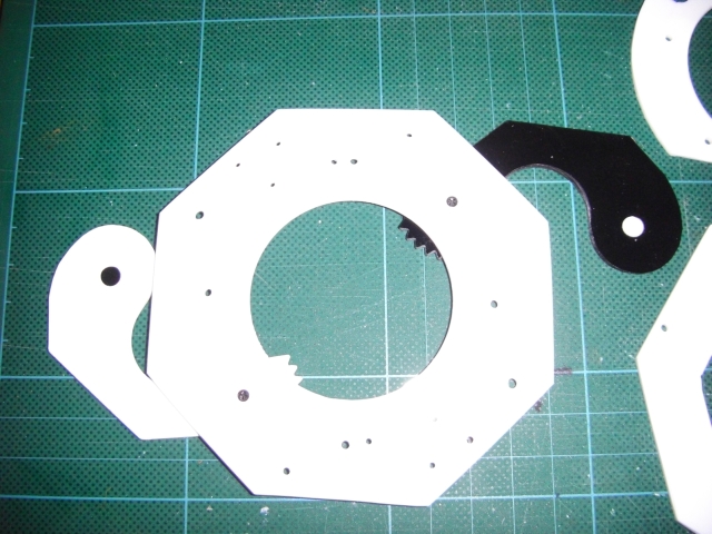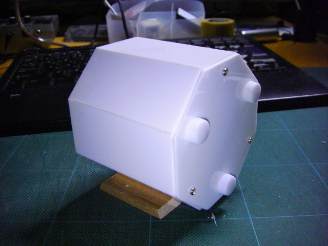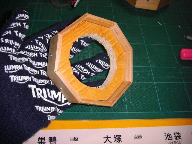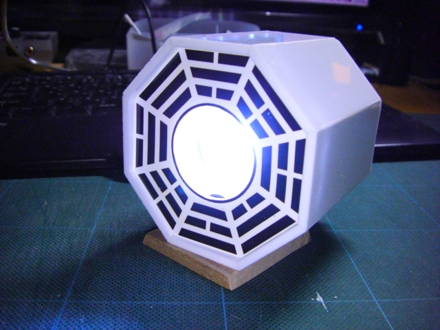 成果物。緋緋色金は手に入らないので、木とアクリルと、ネジとLEDその他で試作。 ちゃんと設計したのは機構部分だけで、外装は雑でズレと隙間と歪みだらけ。 下部を回すと太極図が開いて発光。全閉→全開で45°回転なので八角柱は維持。 機構の設計。 可動部。歯車はクラフトヤスリで削りだした。粉まみれになった。 外装。 小物。 組立開始。太極図(陰陽勾玉巴)から。 発光部を固定する部品。パイプの継ぎ手を利用。ピンボケミス。 可動部2。 中心部と太極図の連動。 可動部固定終了 全開/全閉に動くアシストバネ。安全ピンから加工した。 外板の基礎になる厚板。 外板を固定。 途中で八卦図と保護用アクリルを追加。 上部完成 下部の外板も同様に。 発光部を固定。 スイッチ固定。 スイッチ操作用の棒を追加。 下部を固定。 電池を接続。 蓋をして完了。ここまで見た人お疲れ様でした。 発光時の背後。うっすら透ける。 |