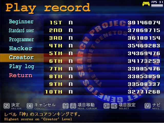 スコアランキングもあるが、上位三人はまさに桁違いのスコアを出してて次元が違う(バグ利用) まぁウチは入力の取りこぼしが激しい事もあって(GENETOSと相性が悪いのか1/1000レベル) 1面クリア出来る率が1/10~1/100くらい。キャプチャファイルが増えまくる。 「撃たなかった」はまだ良いが、「動かなかった」「止まらなかった」は気付いた時には 大概被弾してるんだよね。 これがLv3以降は自動連射&判定が小さくて生き残れる&死んでもボム稼ぎになるから、 1&2面のリトライが異常に多い。 まずは通常難度(StandardUser)でノーミス 続いてノーボム ネタプレイ。初期自機で最終面から(1/2) 初期自機で最終面から(2/2) ネタプレイ。専守防衛 最高難度(Creator)ノーミス と言っても東方みたいに難しくない。 通常プレイ